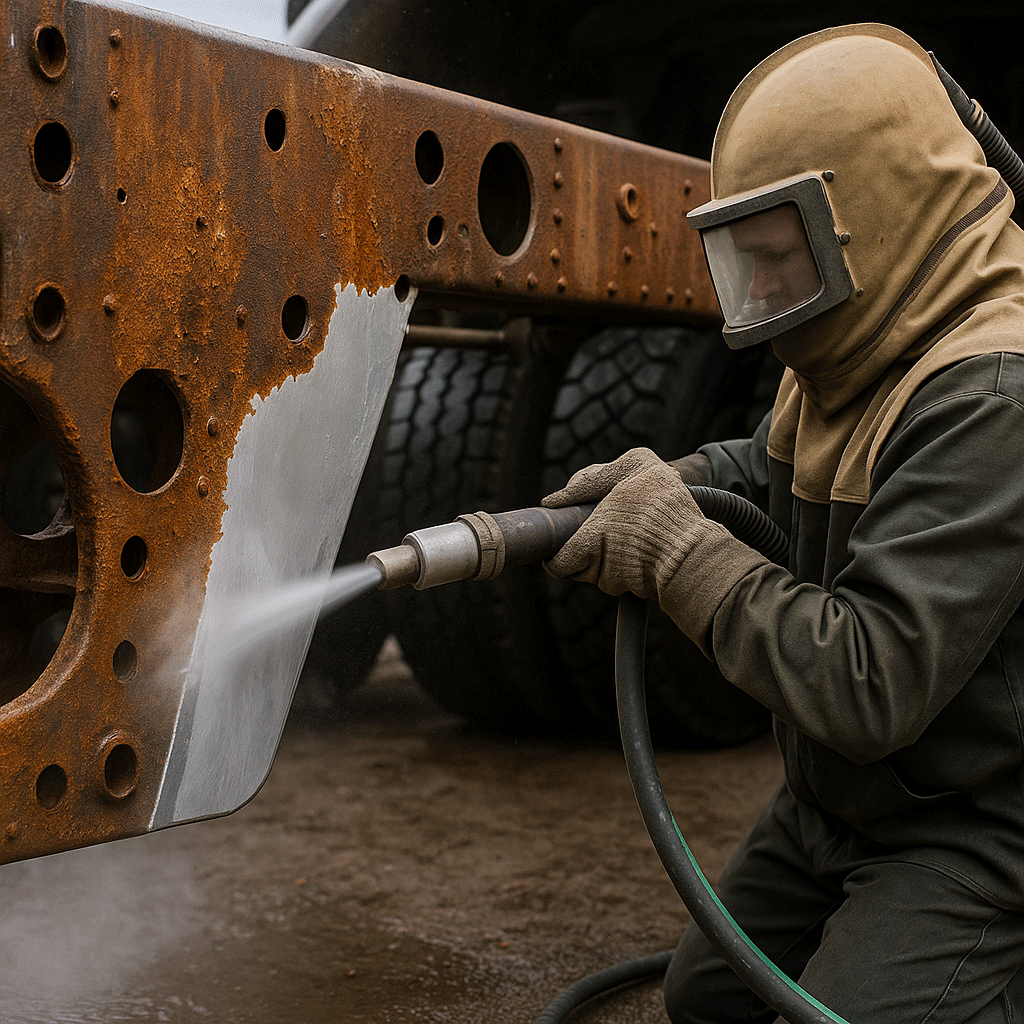 A vizes homokszórás pormentes, kíméletesebb eljárás, amivel a felületről eltávolítjuk a rozsdát, festéket, szennyeződést vagy az időjárás okozta elszíneződést. Ideális nagyobb, erősen igénybe vett felületekhez is.
