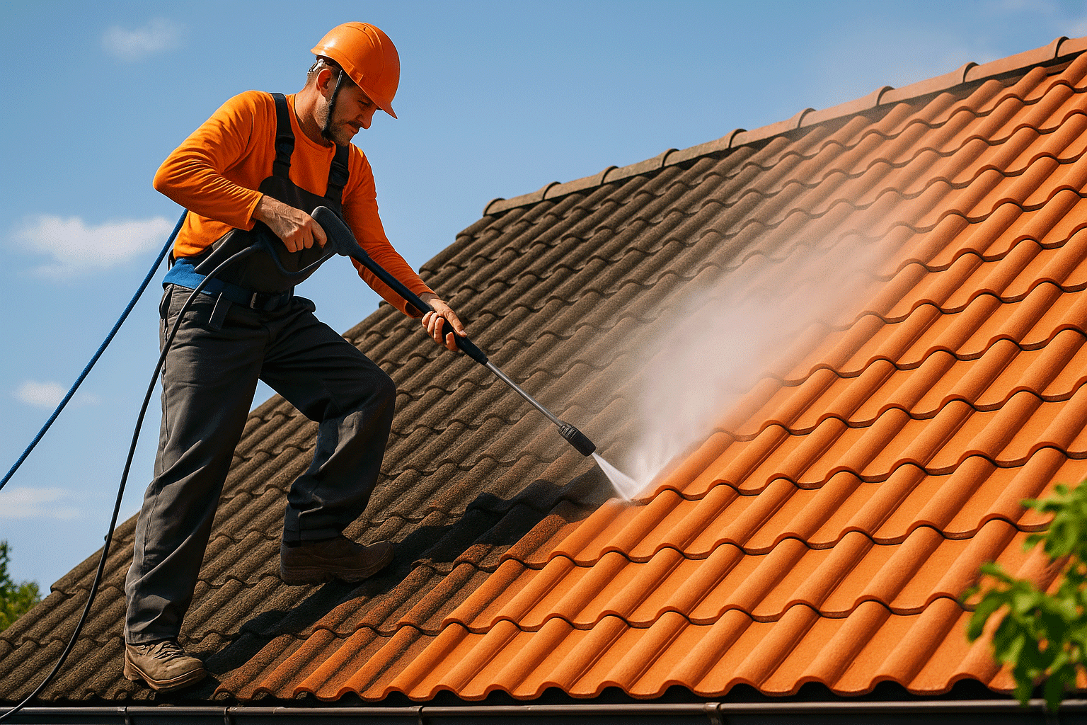 Tető tisztítás biológiailag lebomló tisztítószerrel és magasnyomású mosóval